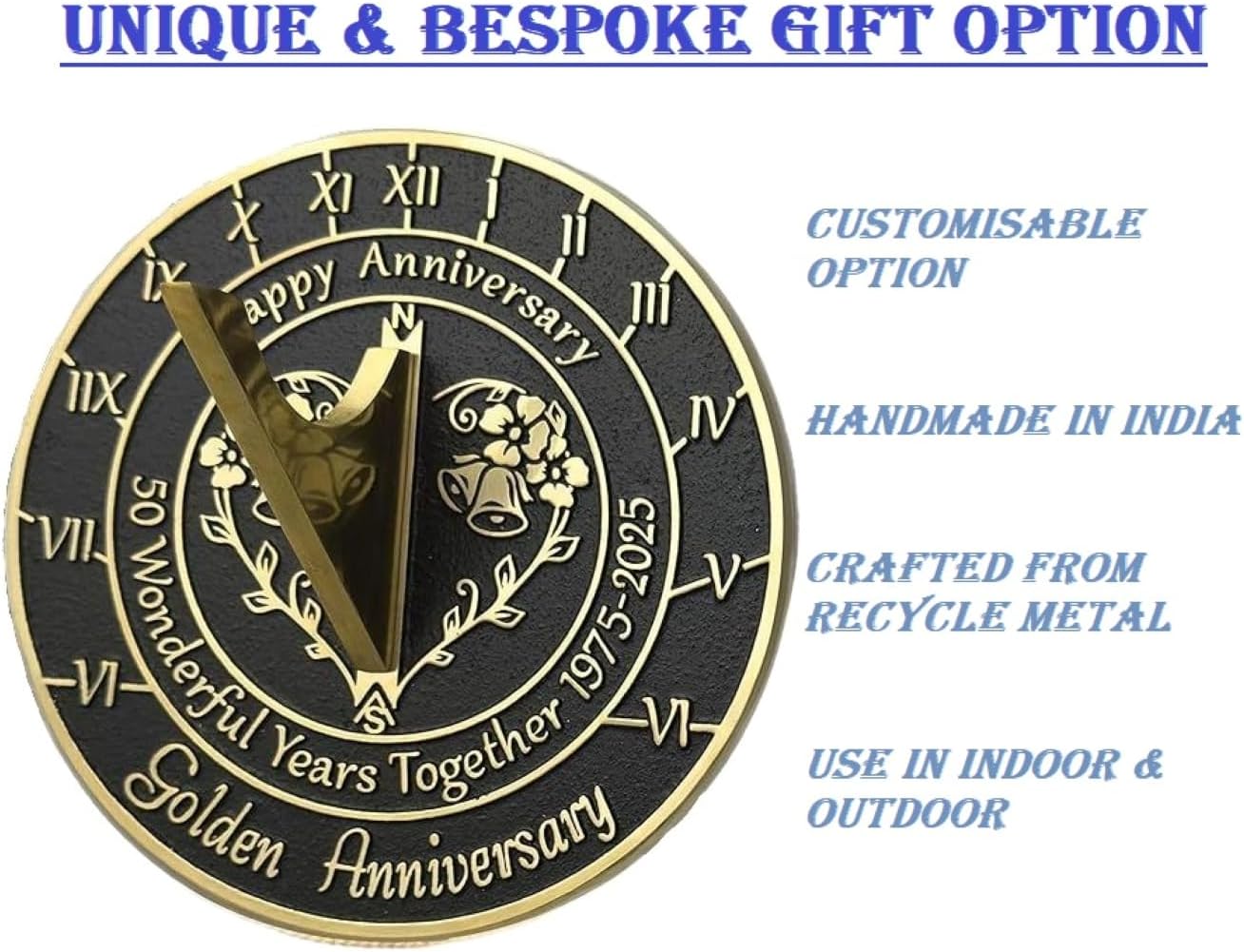 50 Wonderful Years Together, What a Gift. To Match that opt for a Solid Brass Golden Anniversary Sundial Gift Handmade. Grab the Gift Everybody will wish they’d found first. Your Garden's Decor Brass Golden Sundial are hand Carved to order as they are designed to be site Specific. The designs are large and Impressive. High Quality thick Brass, Our Craftsmen Combine Simplicity, Elegance and durability into every Single Sundial and for this 50th Golden Wedding Anniversary Version, They finished it in Black. Measuring: 10" across by 5" high, With Pedestal Stand Dimensions : Height: 585mm (23") Width (at base): 300mm (11¾"). ‘Golden Anniversary' 50 Wonderful Years Together 1975-2025. Please see that the order you placed is from Online Solution inc.