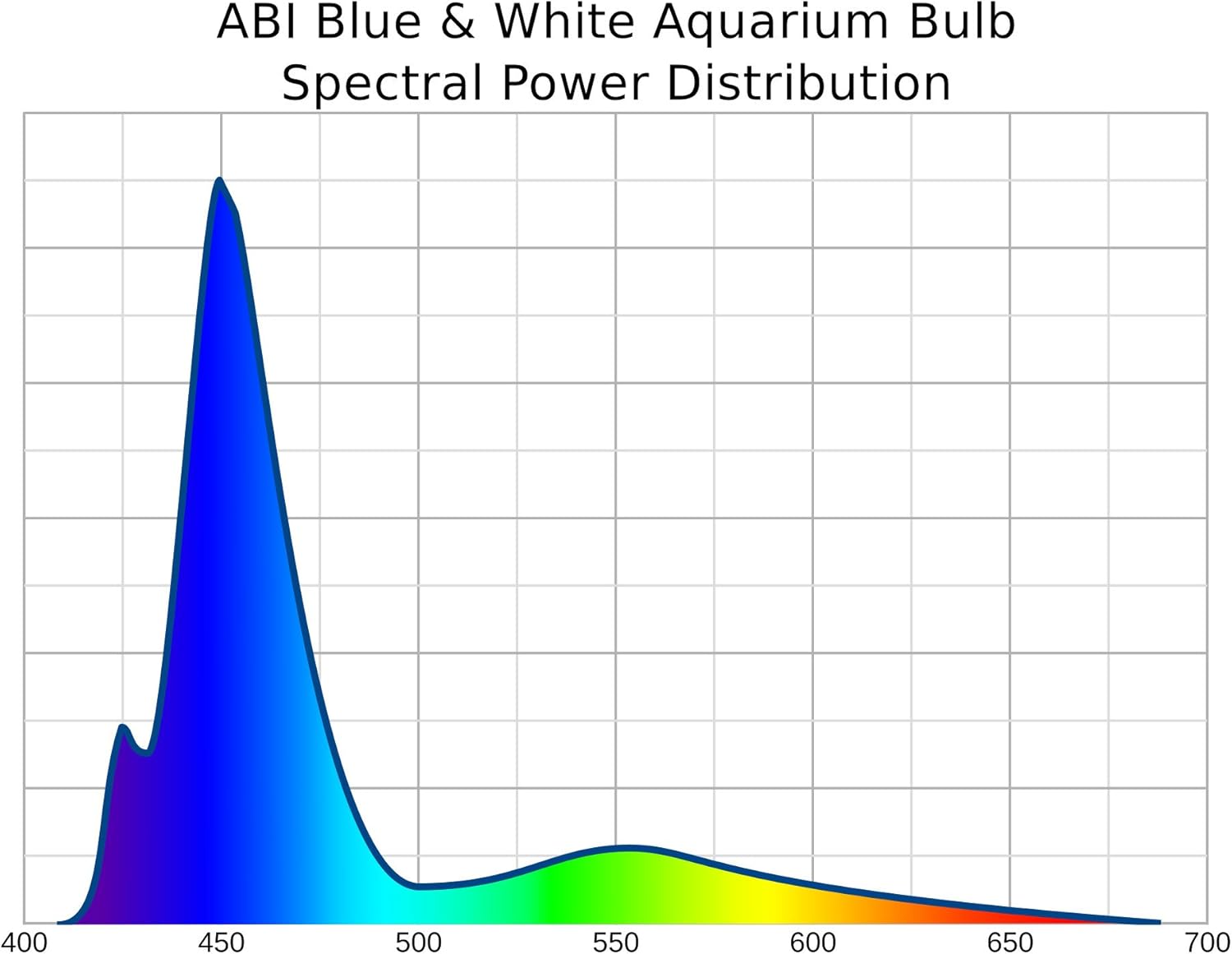 Optimal spectrum, high efficiency, quality components, and sturdy construction make the ABI blue and white aquarium light bulb the smart choice for both freshwater and marine aquariums. This light was developed to deliver superior lighting for growing aquatic plants and marine invertebrates such as corals and for illuminating fish and decor. The new 15-chip design uses 15x3W chips running at reduced current to improve the efficiency and longevity. Total power consumption is only 12W. By combining three different wavelengths of blue light with cold white light, the ABI blue and white LED bulb promotes plant growth, encourages coral florescence and blooming, accentuates the fluorescence of fluorescent fish, and provides a beautiful viewing environment.