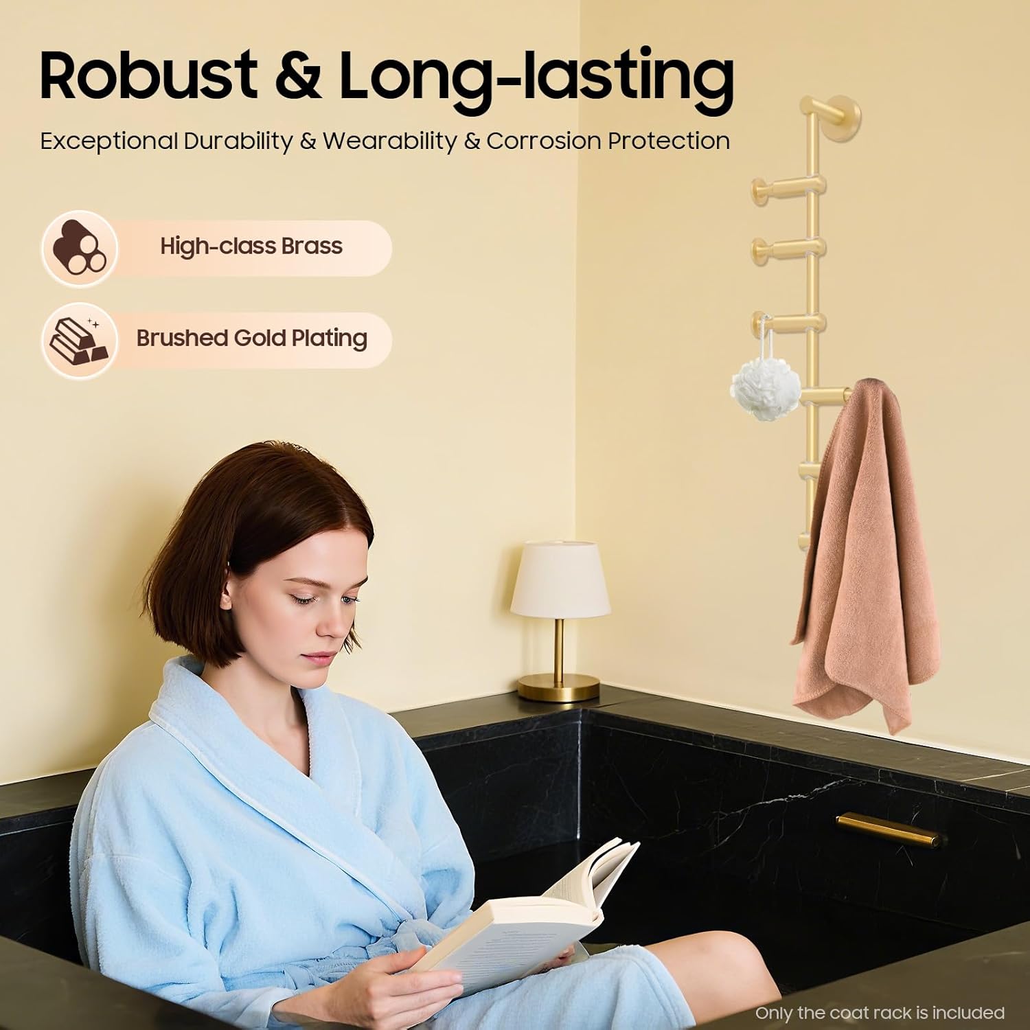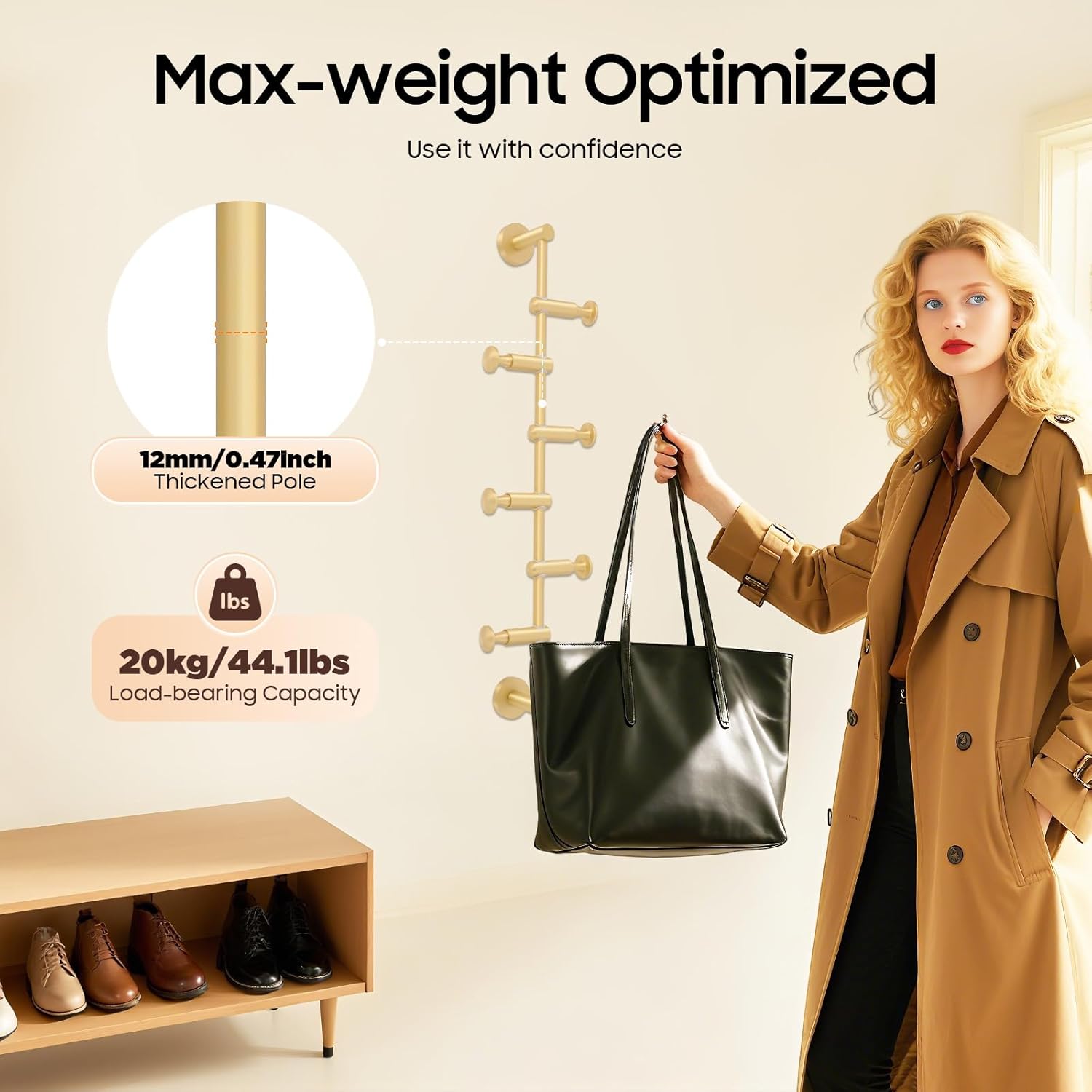 How to Install1. Remove wall dust with a towel(not included). 2. Confirm the installation position and mark it with a marker pen(not included). 3. Remove the fixed chassis of the product. 4. Mark the punching position with a marker pen(not included). 5. Drill holes in the perforated position with an electric drill(not included). 6. Tap in the expanded screws and use a knife(not included) to trim off the protruding silicone head. 7. Align the holes and tighten the screws that secure the chassis. 8. Match the base with the fixed base and tighten the screws to fix the product. 9. Installation is complete. SpecificationsMaterial: Brass, PlasticFinish: Brushed Gold PlatedColor: GoldStyle: RetroAssembly Required: YesInstallation Method: Punch Installation Mount Type: Wall-MountedNumber of Hooks: 6Hook Swivelling Angle (After Installation): 180°Load-bearing Capacity: 20kg/44.1lbsPole Diameter: 12mm/0.47inchPole Size: 5*7*60cm/1.97*2.75*23.62inchHook Size: 9*3*1.9cm/ 3.54*1.18*0.74inchPackage Included 1* Coat RackAll Accessories for AssemblyNotes1. Please check the size carefully before ordering.2. Please note that clothes are not included.3. Please try to maintain a constant room temperature and humidity, the appropriate room humidity is 45%-65%. 4. Please do not contact with acidic substances, salt water, all kinds of grease, or chlorine, do not use steel wire balls and other hard wipes to clean the product, as it will damage the antioxidant layer, and accelerate oxidation.