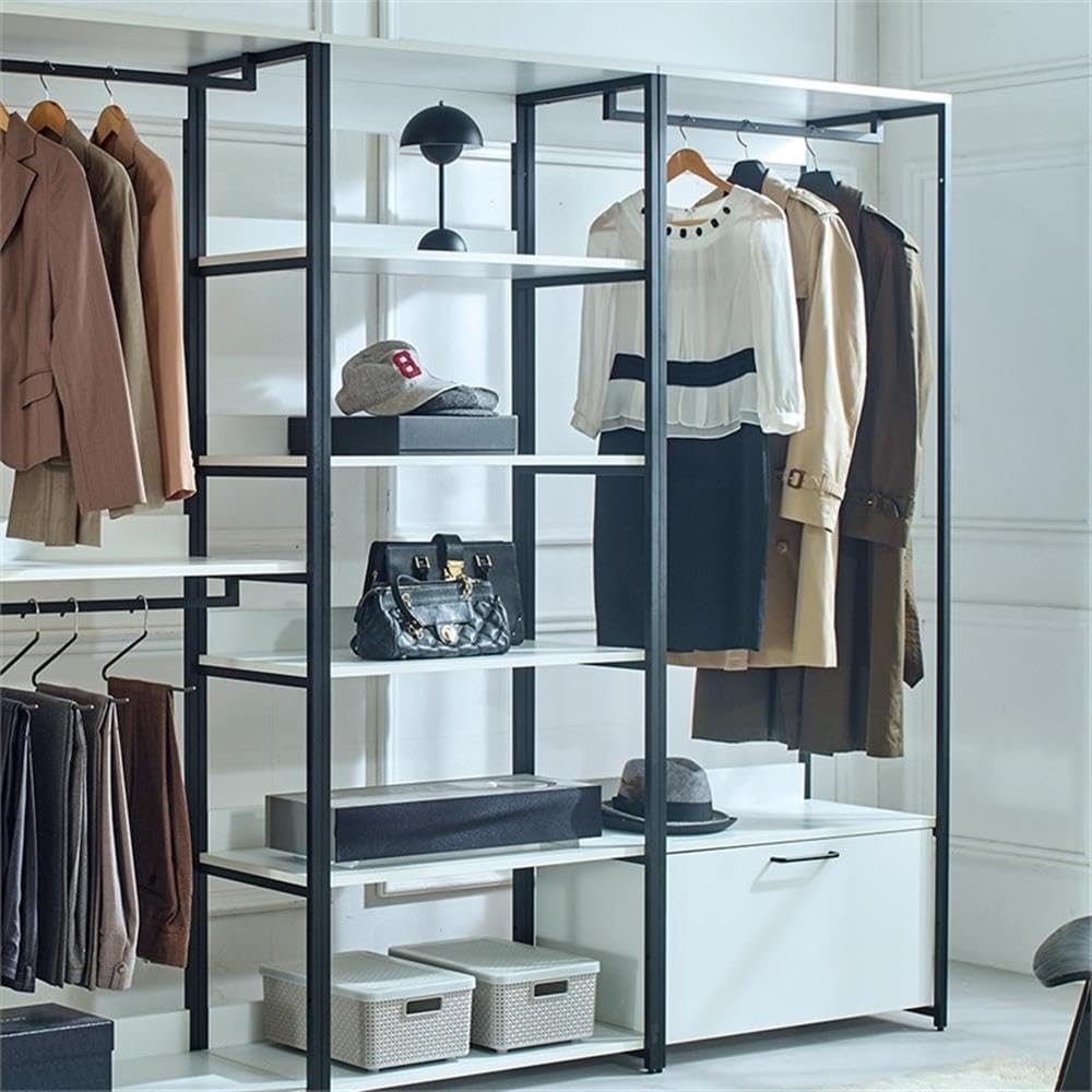 Configure your closet in the way that suits you best with this freestanding walk in / reach in closet organizer comes with 4 tower units with spacious storage space. The Fiona closet organizer is constructed using eco-friendly E0 graded melamine boards with a special edge banding material called ABS, which is 2 times thicker (1 mm) than the industry average (0.4 mm). Such a technique was fully applied on every 4 sides of the boards, preventing any moisture to get into the boards. The premium white melamine with powder coated black metal frame not only creates a unique and stylish two-tone look, but also enhances the closet's durability. The Fiona Collection also features soft-closing drawers for your convenience and safety. The modular construction offers customizability of your space, ensuring generous space to store all your belongings more efficiently. Easily fold and stack jeans or use to store purses. A classic white wood appearance with a black metal frame will have you organizing your closet in style.Features:- Water and Heat Resistant- E1 Graded Eco Friendly Board- All 4-sided 2x thicker edgebanding for durability- Scratch Resistant- Powder coated metal frame- Modular- FreestandingSpecifications:- Product Dimensions: 77.7"H x 96"W x 17.3"D- Product Weight: 217
