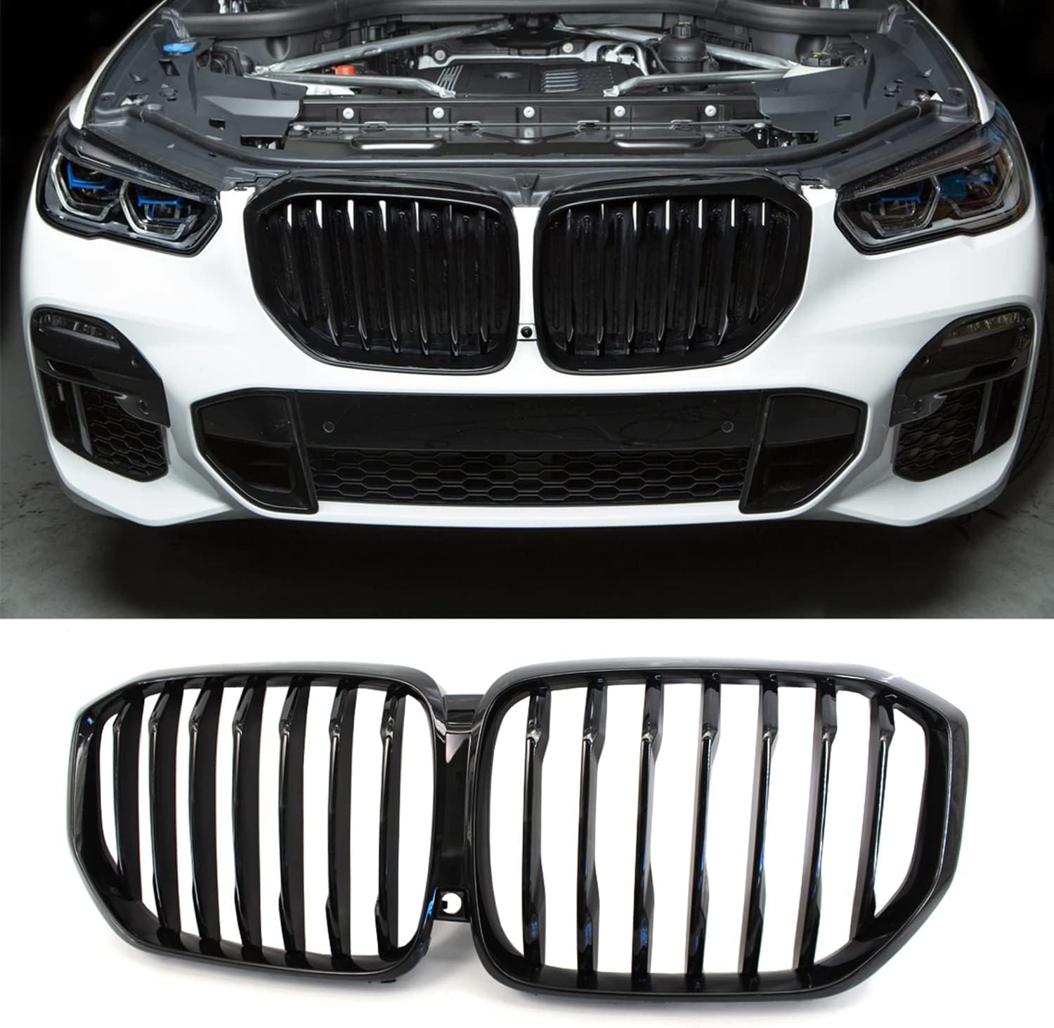 Specifications: Front Bumper Grille Grill Compatible with BMW X5 Accessories Gloss Black Kidney Grille - Package includes: 1 Set of Front Kidney Grille - Color: Glossy Black, Double Slats - Material: High Impact ABS Features: - Special single slat performance look design - Made of High Impact ABS Material With Light Weight & Durability - Direct Snap-On OEM Replacement - Easy Installation. No modification required. - Installed by using sturdy clips and tabs in minutes with seamless fit. - Each outer ring and grille slat are individually UV finished with precision that yields a product of superior paint quality. Specification: -Type: Front Grille -Placement on Vehicle: Front -Color: Glossy Black -Material: Arcylonitrile Butadine Styrene -Size: 43.5 x 22 x 6.9cm Part Number: 51712334708, 51117294485, 51137316061(LH), 51712334710, 51117294486, 51137316062 (RH) Compatible with: 2014 2015 2016 2017 2018 X5 F15 35d xDrive / 35i / 35i xDrive / 40e xDrive / 50i xDrive 2015 2016 2017 2018 2019 X6 F16 35i / 35i xDrive / 50i xDrive 2015 2016 2017 2018 2019 X5M F85 / BMW X6M F86 Not fit for vehicle equipped with night vision camera. Package Includes: One Pair Front Grilles (left and right side)