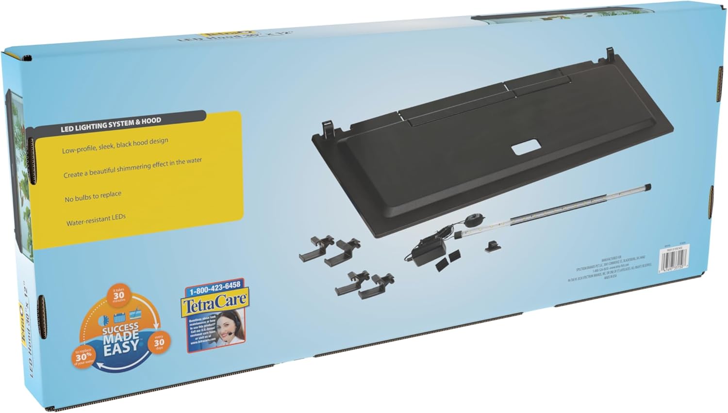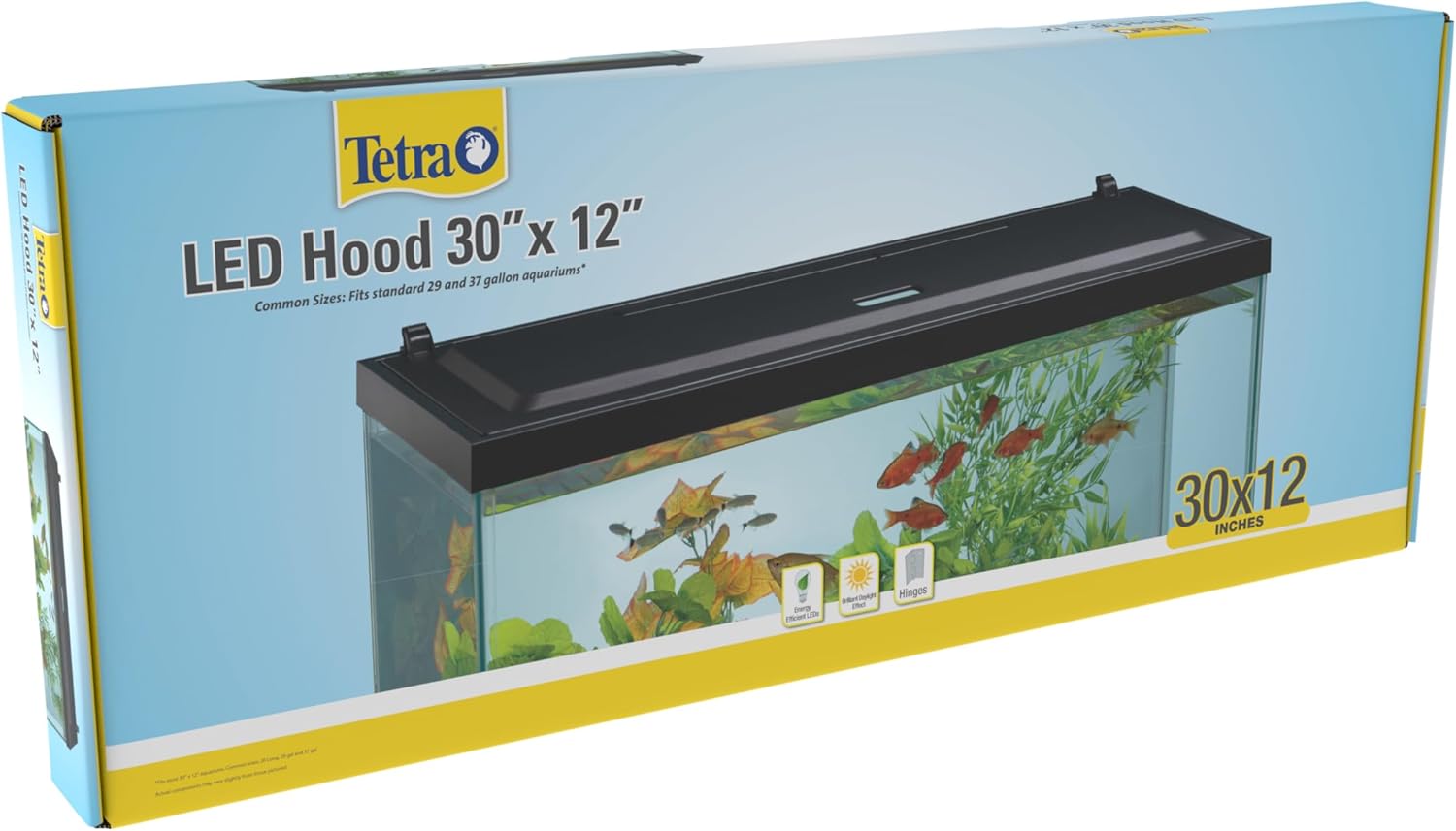 Tetra LED Hood makes an attractive and functional canopy for your aquarium. The low-profile black hood lends your aquarium a sleek appearance, and the hidden, energy-efficient LEDs inside create a natural daylight shimmer effect underwater. Cutouts in back of the hood fit a variety of filter sizes so you can customize your fish tank as needed. Hinged for easy opening and closing. Tetra LED Hoods are available in a range of sizes to fit most rectangular tanks. This aquarium hood fits most 30 inch by 12 inch aquariums (common sizes 20 gallon long, 29 gallon and 37 gallon). Small aquariums are a great way to get started in the freshwater fishkeeping hobby, and with any new hobby involving living creatures, it is always best to learn as much as you can. When buying fish, ask your retailer for guidance in choosing the right fish for your size aquarium. Since 1951, Tetra has developed the world’s most comprehensive body of fish food knowledge, and fishkeeping enthusiasts have looked to the brand for products and solutions that add ease and beauty to their home. Whether you're an experienced hobbyist or just starting out, Tetra has everything you need – from a large variety of quality fish food and innovative equipment to test kits and decor.